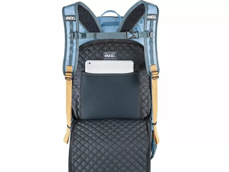 La Evoc Mission Pro es una mochila de 28L con accesso rapido al compartimento para el portatíl. Cuenta con un bolsillo delantero con cremallera y organizador y con dos otros bolsillos laterales